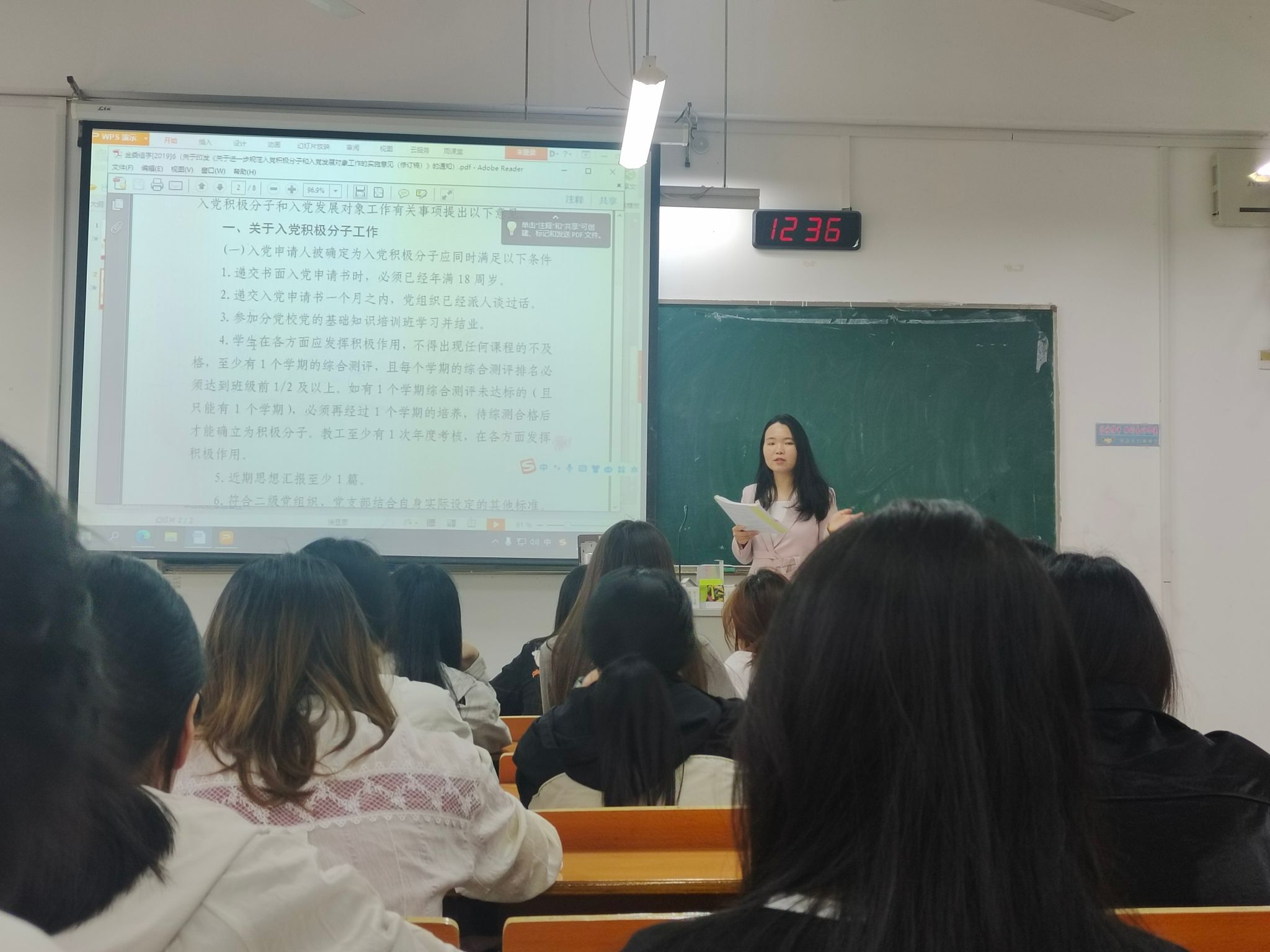 会议伊始,朱老师介绍了确定入党积极分子的标准,并强调确立入党积极分子必须把政治标准放在首位,学习成绩、能力素质、道德品行等也是确立和考察入党积极分子的重要方面。朱老师希望同学们在学习和生活的各个方面严格要求自己,发挥模范带头作用,利用好课内外时间加强党的理论知识学习不断提高自己的政治觉悟和综合素养。随后,朱老师就党员的发展流程做了详细介绍。朱老师指出,党员发展严格按照发展要求和标准,通过规范化和严格化的工作程序,不断为党组织培养具有坚定信仰、优秀品质和社会责任感的人才。入党积极分子作为党员发展的储备力量,要不断向优秀党员看齐,争取在思想上入党、在行动上入党、进而在组织上入党。