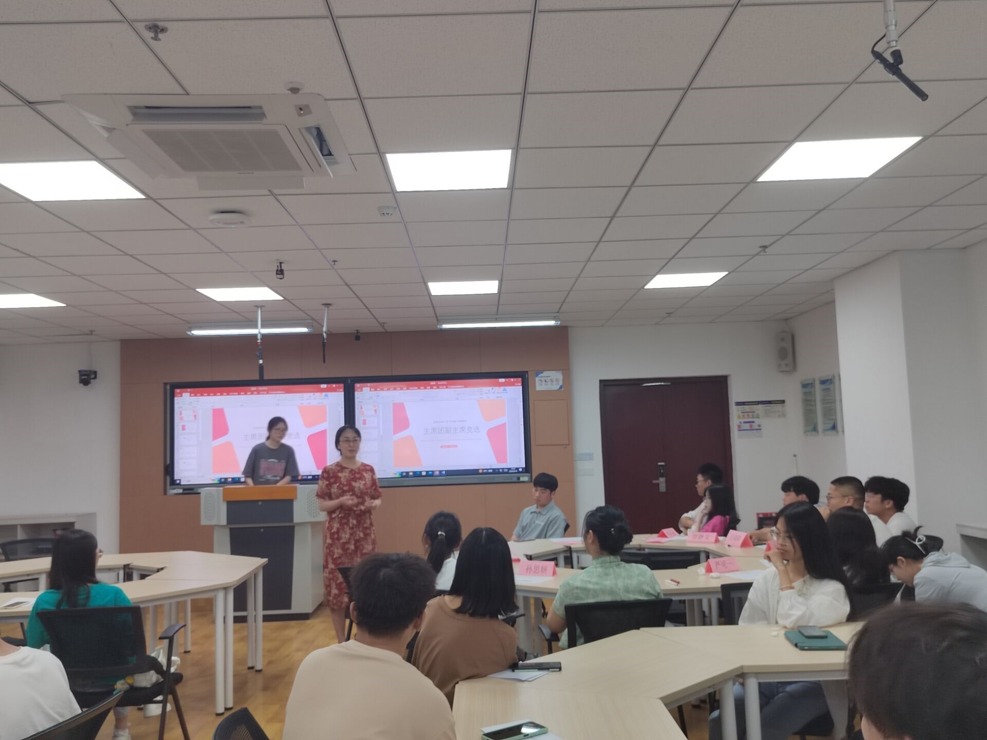 参加此次活动的评委有辅导员高园老师、学联主席团以及各部门部长。活动开始前,由王志杰副主席对我院学联上一学年的工作进行总结并且对学联的成员表示感谢。然后,竞选人依次上台发言,发言的内容主要围绕个人经历、工作优势、竞选展望部分进行展开。各位评委们根据每位学生的介绍,结合实际工作提问。最后由高园老师上台讲话,首先高园老师对一年来学生联合会全体成员的辛勤付出表示感谢,同时对接下来如何做好部门工作提出建议:各部门部长、部员要清楚认识了解部门职能并做好自身本职工作;在新一学年更多学生到来的情况下,希望新负责人能系统规范工作流程;在解决工作时,需要将解决问题放在首位,高效沟通解决。