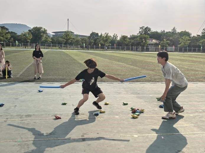 活动设置了三个趣味游戏。在“老鼠爱大米”游戏中,小组两两对抗,攻防双方斗智斗勇,攻击方接力运“大米”,防守方持道具守护,攻防交替间尽显团队协作智慧;“球绽燃光”游戏里,小组成员蒙眼听指挥完成大象鼻转圈、破气球等任务,击掌接力考验默契;在“贪吃蛇找伙伴”中,“蛇头”们蒙眼寻伴,搭肩成“蛇”回起点,语言指挥凸显信任力量。各环节游戏融合了趣味性与挑战性,现场欢笑声起伏不断。