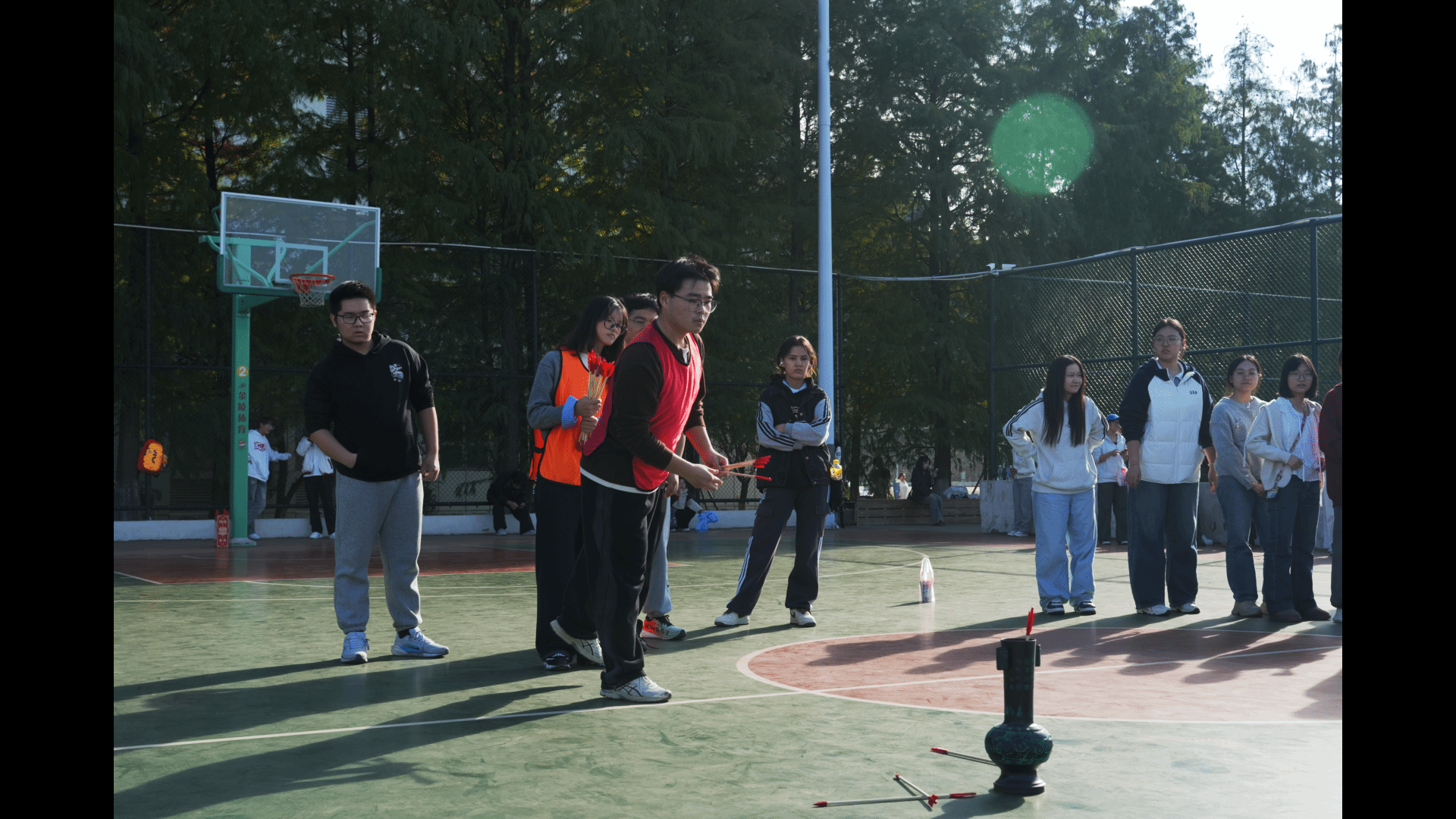 本次运动会共设民族健身操、板鞋竞速、投壶、锤丸、蹴鞠、射艺六个项目,开幕式过后,各项目紧锣密鼓地展开。投壶时,张佳诚同学屏气凝神,将箭矢稳稳投入壶中;捶丸现场,何美玥同学专注瞄准,挥杆击球,小球在场地滚动;射艺区内,顾梦洁同学拉弓搭箭,利箭如流星般精准射向靶心,整个过程充满了传统运动的独特韵味与竞技魅力。最精彩的板鞋竞速项目中,田梁伟、李冒辉、胡子强等人同穿一双板鞋,配合默契地大步向前,在跑道上如同一道紧密相连的闪电,奋力向终点冲刺,场外加油声此起彼伏,气氛热烈。