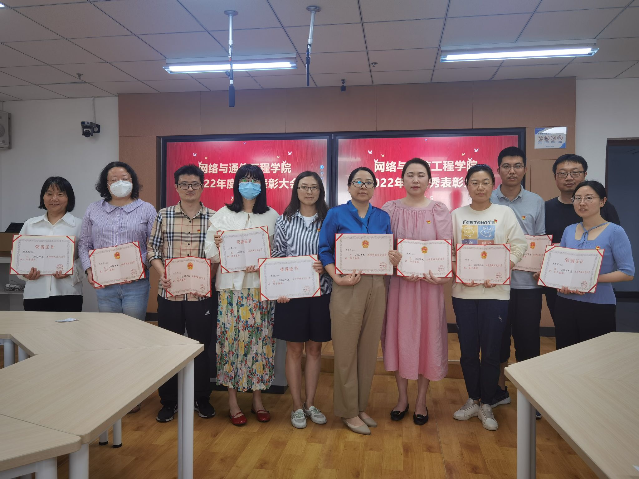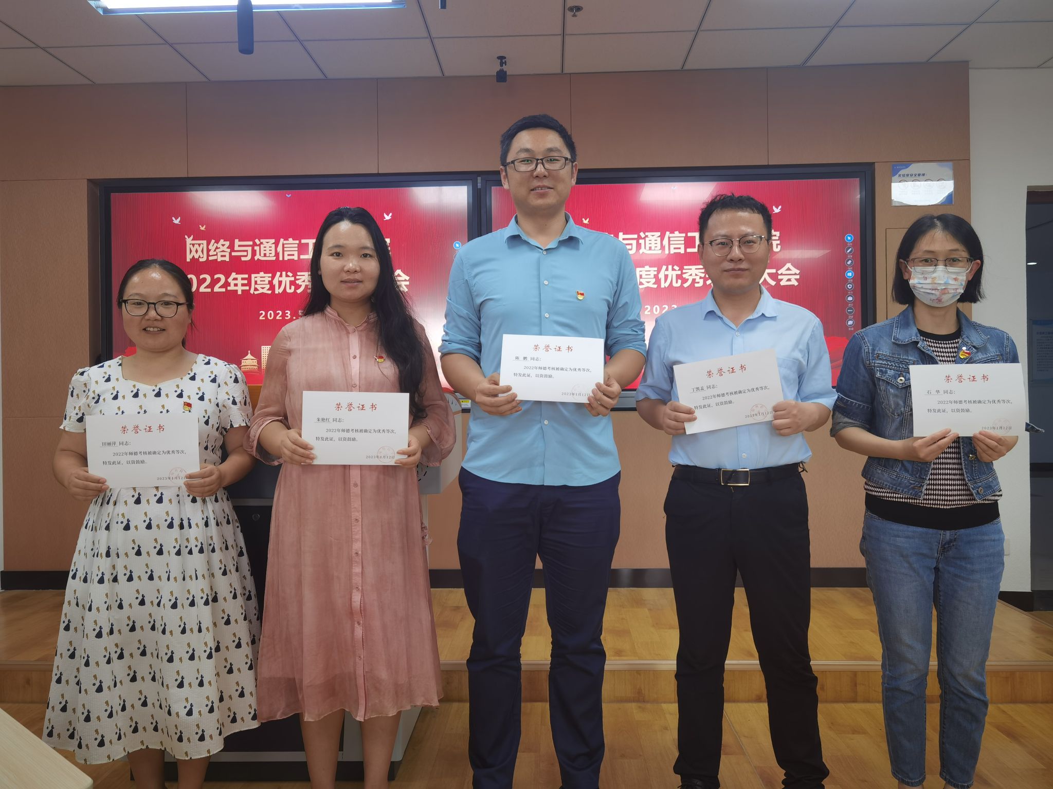 为加强团队建设示范引领作用,充分发挥教师典型模范带头作用, 5月31日下午,我院在科技4号楼604-1召开2022年度优秀表彰大会。院党委书记陈健、院长田锦、院党委副书记董宇、副院长王池社分别给2022年度获得记功、校优、师德优秀、院优荣誉的老师颁发了荣誉证书,表彰在教学、科研和管理服务岗位上作出重要贡献的教职工。