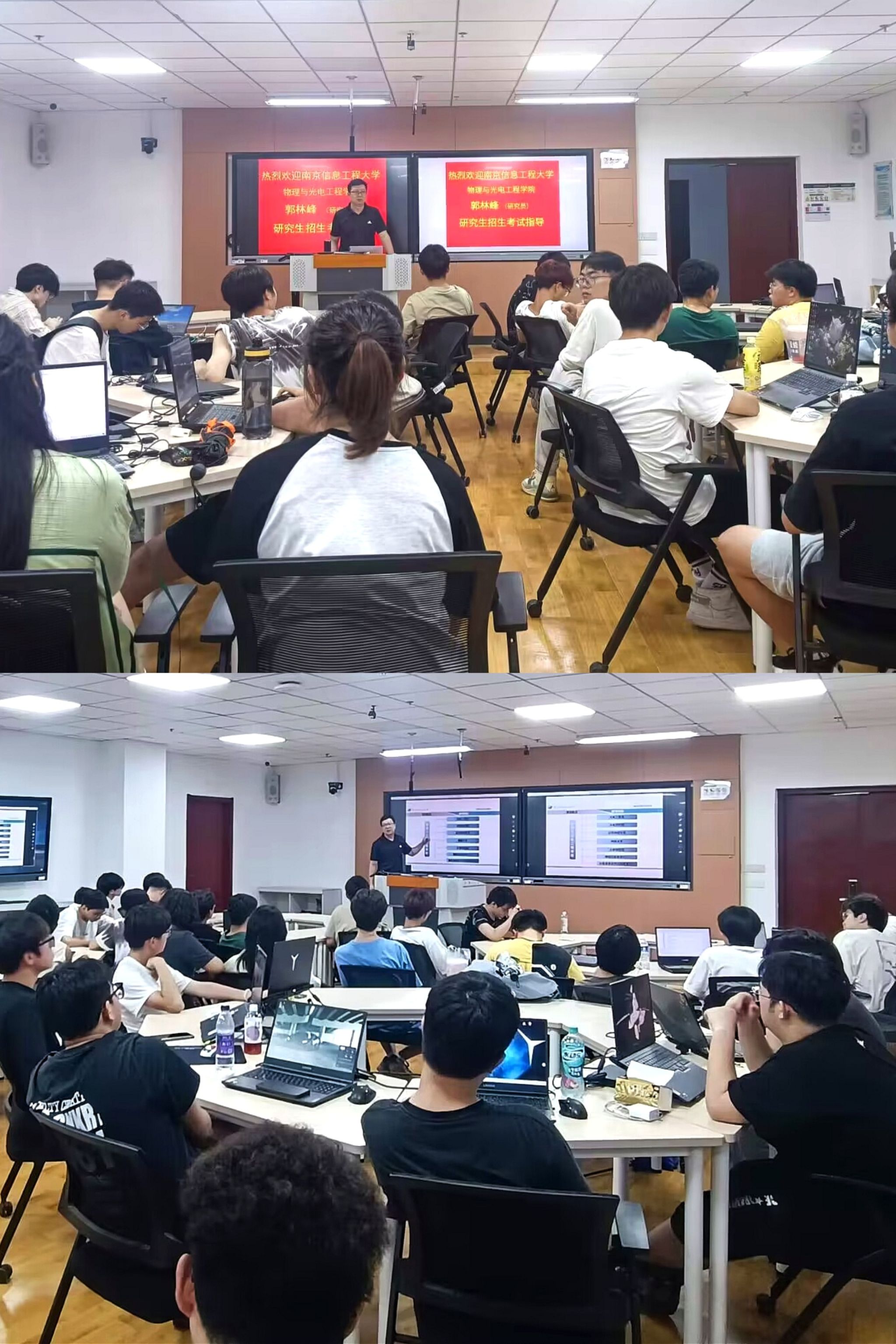 郭林峰研究员从建校历程、学校使命、重点专业、学科建设、师资情况和教学团队等方面介绍了南京信息工程大学的学校概况,特别介绍了物理和光电工程学院近些年在教科研究方面取得瞩目的成绩。同时,他结合我院学院学生专业特点着重介绍了硕士点历年分数和招生人数,对光学工程(学硕),光电信息工程(专硕)进行了细致讲解,并与到场学子进行互动答疑,现场氛围热烈浓重。