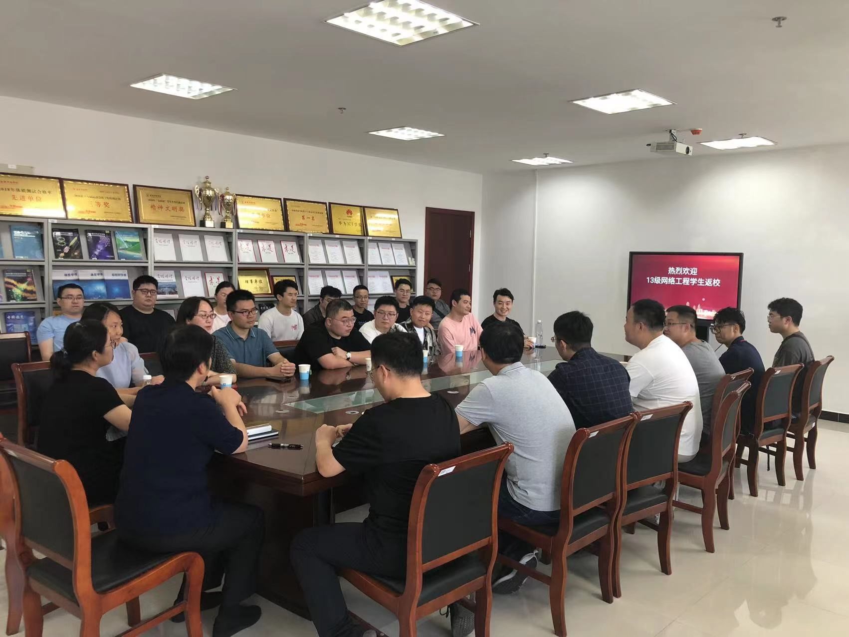 在科技楼四号616会议室,网通学院党委书记陈健、党委副书记董宇、班主任姚健东老师、网络工程专业教师代表及辅导员陪同校友们欢聚一堂,追忆往昔,寄望未来。